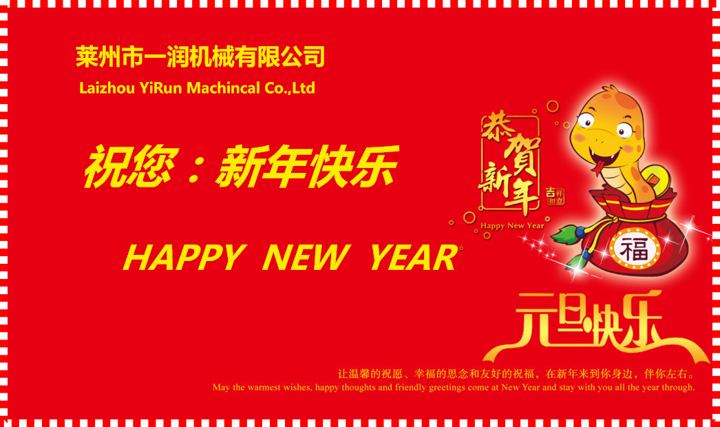 On the coming of the New Year's Day, on behalf of all employees of Laizhou Yirun Mechanical Co., Ltd., We would like to extend my sincere blessings to you and your family. Wish you happiness and well-being, all the best!